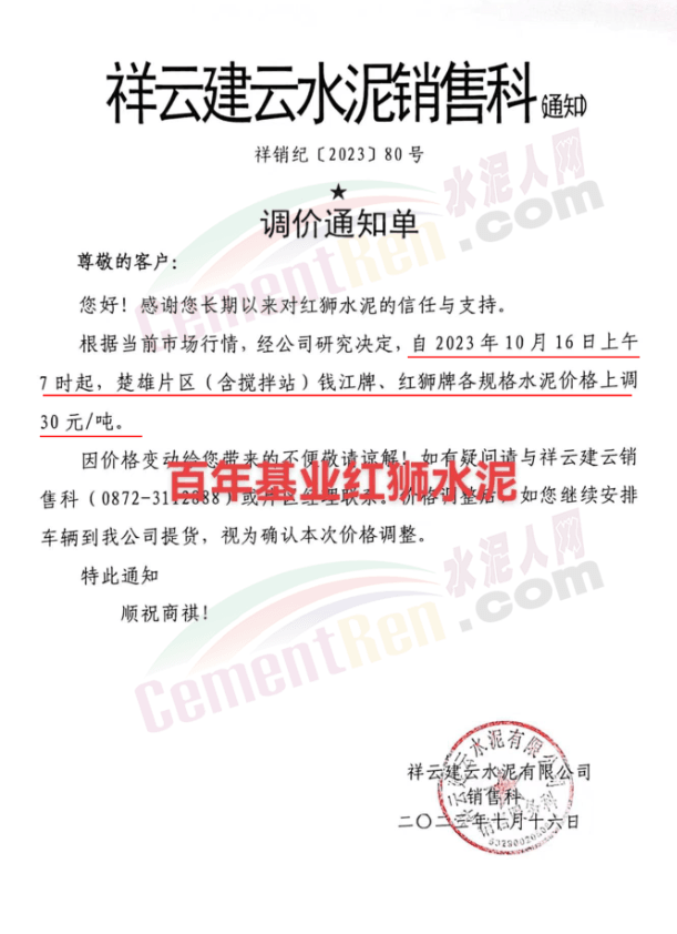 紅獅水泥旗下祥云建云水泥有限公司銷售科通知,根據當前市場行情,經公司研究決定,自2023年10月16日上午7時起,楚雄片區(含攪拌站)錢江牌、紅獅牌各規格水泥價格上調30元/噸。