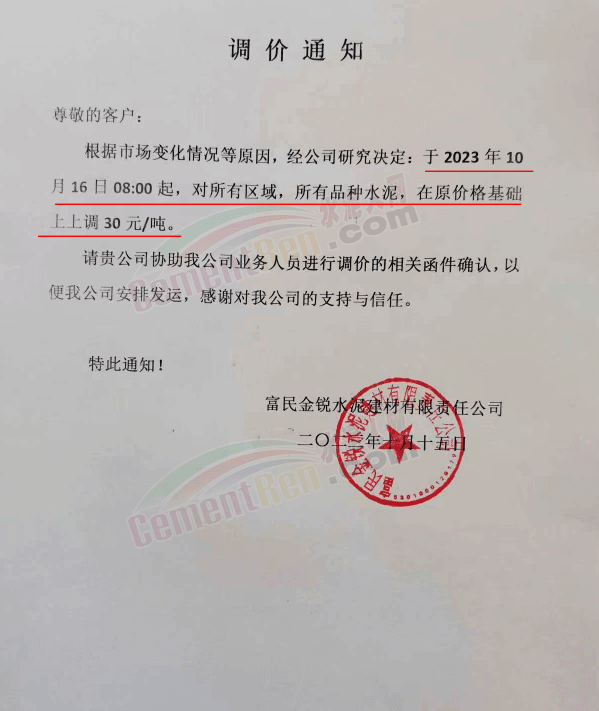 富民金銳水泥建材有限責任公司通知,根據市場變化情況等原因,經公司研究決定,于2023年10月16日8時起,對所有區域,所有品種水泥,在原價格基礎上上調30元/噸。