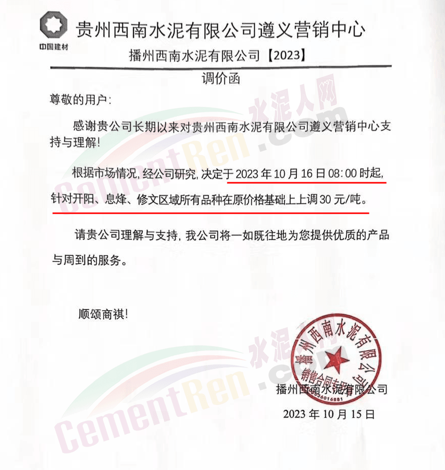 貴州播州西南水泥有限公司通知,根據市場情況,經公司研究,決定于2023年10月16日0800時起針對開陽、息烽、修文區域所有品種在原價格基礎上上調30元/噸