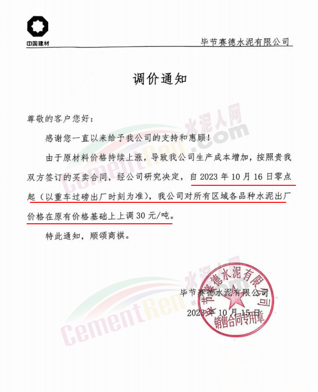 畢節賽德水泥有限公司通知,由于原材料價格持續上漲,導致公司生產成本增加,經公司研究決定,自2023年10月16日零點起,對所有區域各品種水泥出廠價格在原有價格基礎上上調30元/噸。