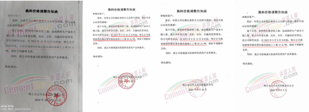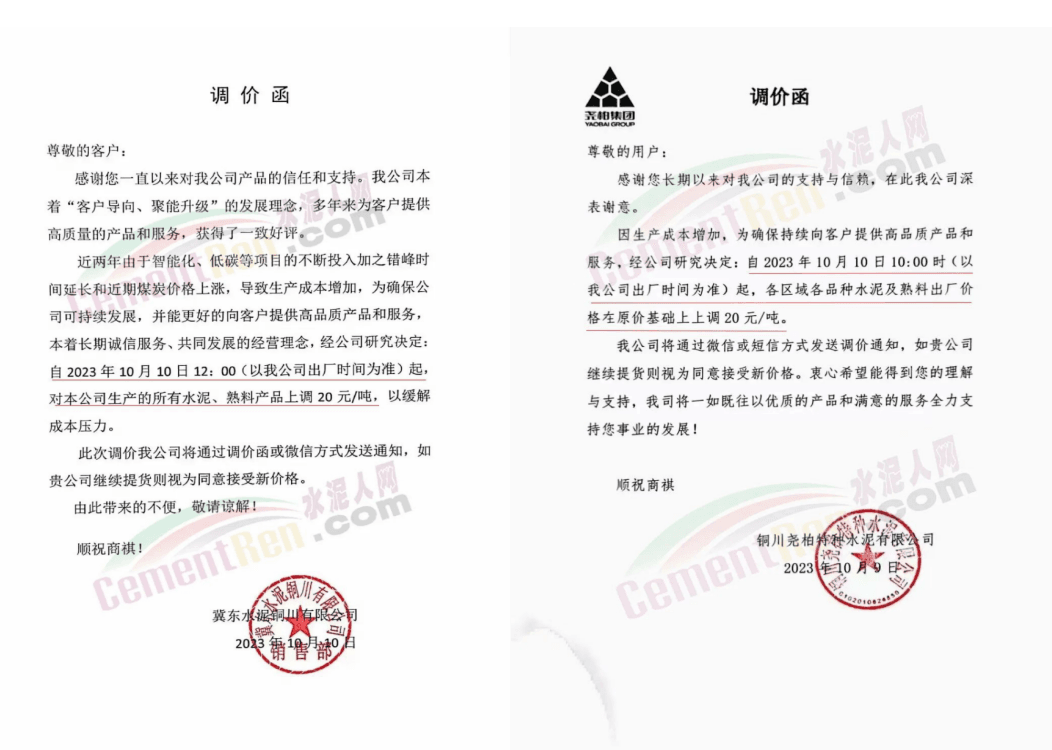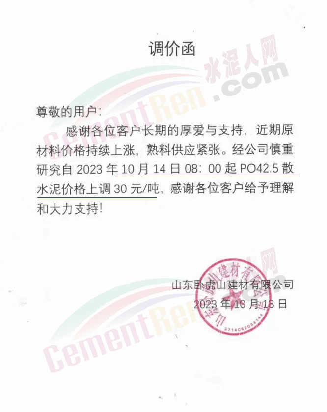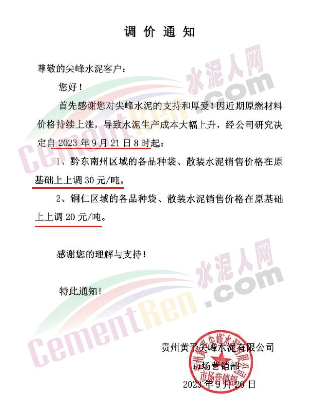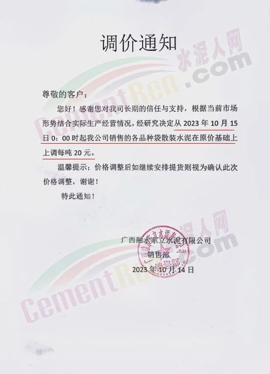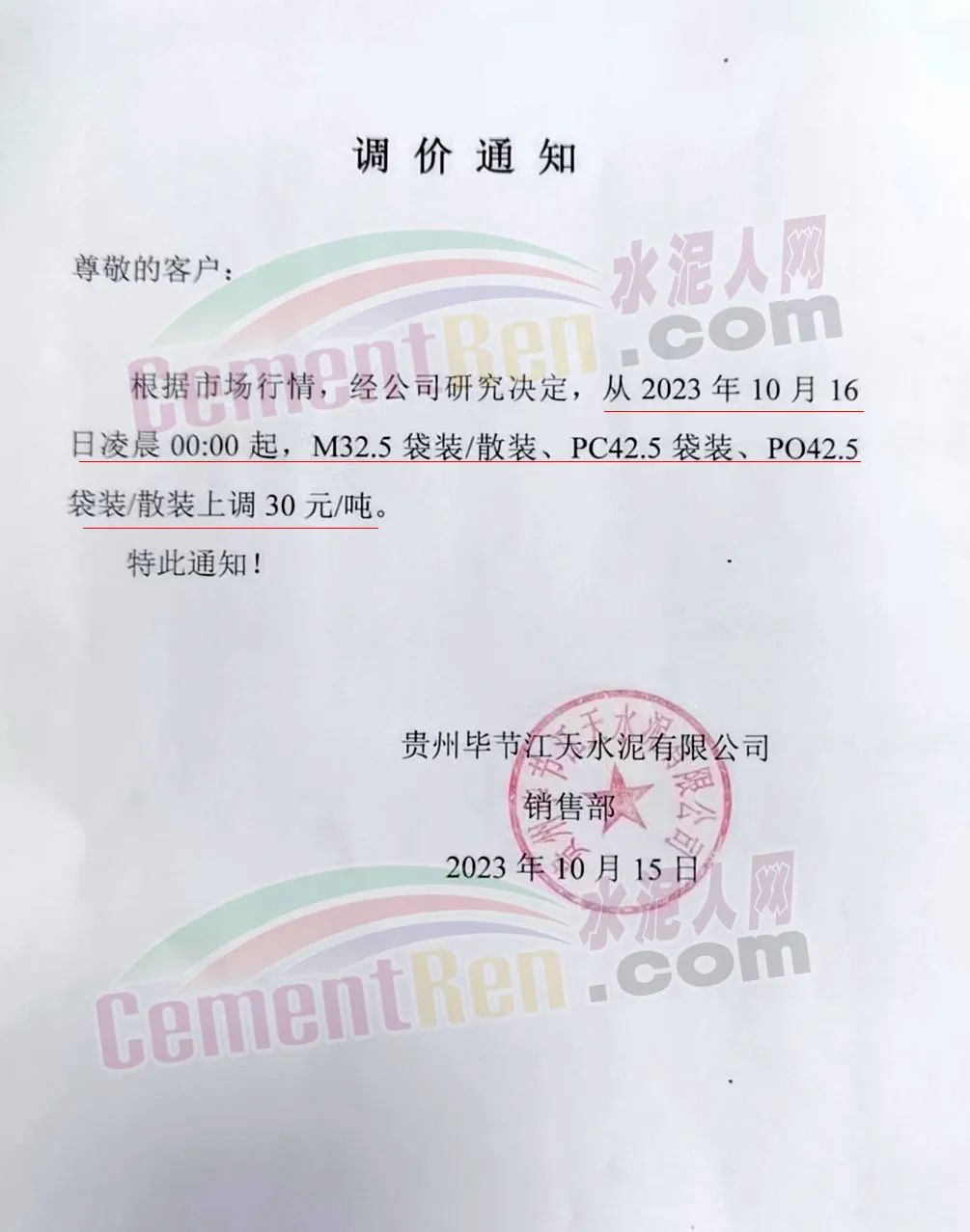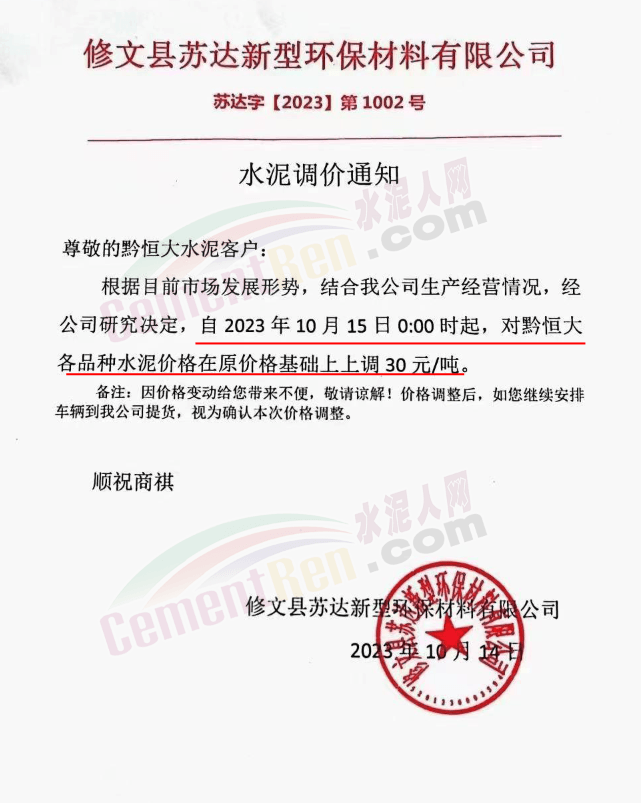 廣西桂林修文縣蘇達新型環保材料有限公司通知,根據目前市場發展形勢,結合公司生產經營情況,經公司研究決定,自2023年10月15日0時起,對黔恒大各品種水泥價格在原價格基礎上上調30元/噸。