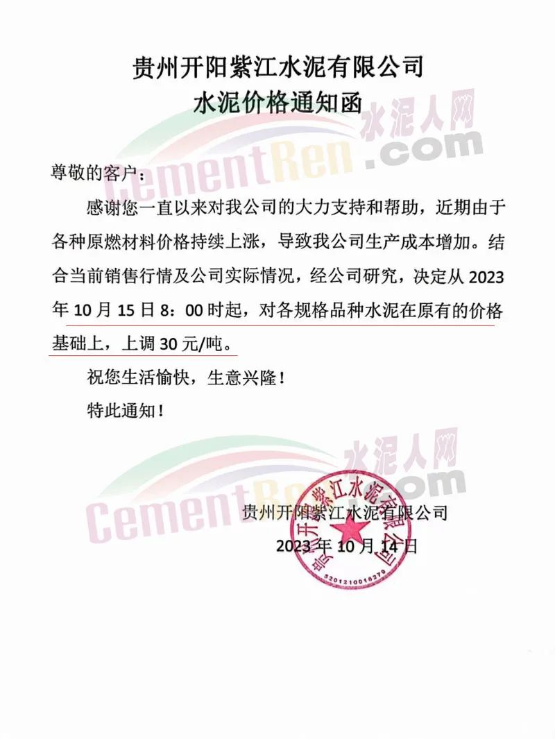 貴州開陽紫江水泥通知,近期由于各種原燃材料價格持續上漲,導致公司生產成本增加。結合當前銷售行情及公司實際情況,經公司研究,決定從2023年10月15日8時起,對各規格品種水泥在原有價格基礎上,上調30元/噸。
