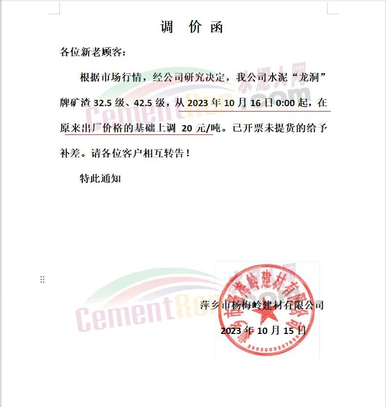 江西萍鄉梅嶺建材有限公司通知,10月16日0時起,“龍洞”牌水泥在原基礎上上調20元/噸。