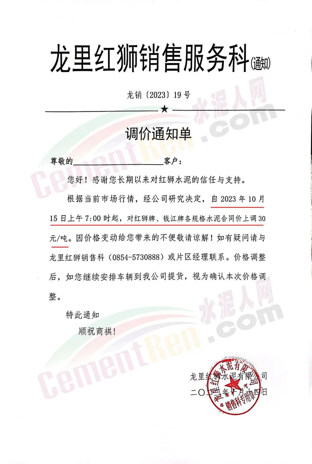 15日前后,貴州紅獅、西南、堯柏水泥等主要品牌企業通知上調水泥報價30元/噸。龍里紅獅銷售服務科通知,自2023年10月15日上午7時起,對紅獅牌、錢江牌各規格水泥合同價上調30元/噸。